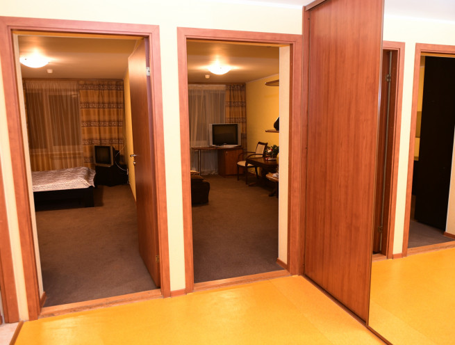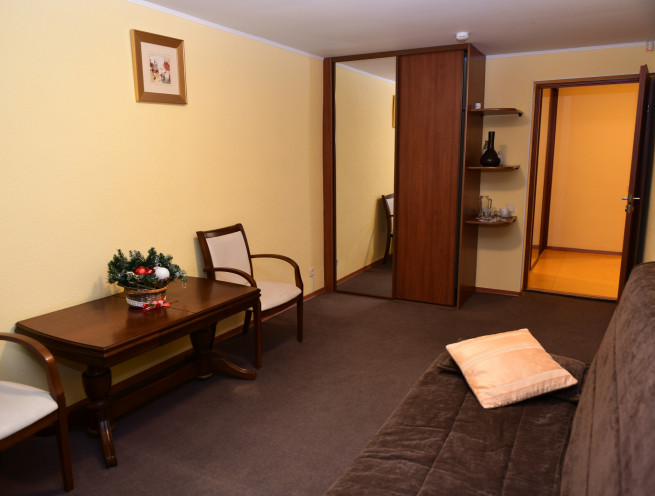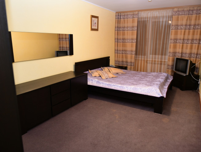2-х спальная не раздвижная кровать, диван,три шкафа-купе,два кресла, журнальный столик, туалетный столик, холодильник, два телевизора, DVD. Санузел совмещенный. Принадлежности для душа. Доп. мест 2