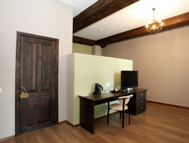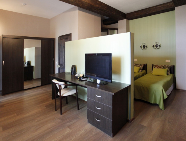 Электронный замок. Окно выходит на южную сторону. Оформлен в серебристо-зеленых тонах. Двухместная раздвижная кровать, два шкафа- купе, диван, фен, журнальный столик, холодильник. Спутниковое телевидение. Спальная зона отделена от зоны отдыха. Санузел совмещенный. В стоимость включены принадлежности для душа, зубные наборы, тапочки.