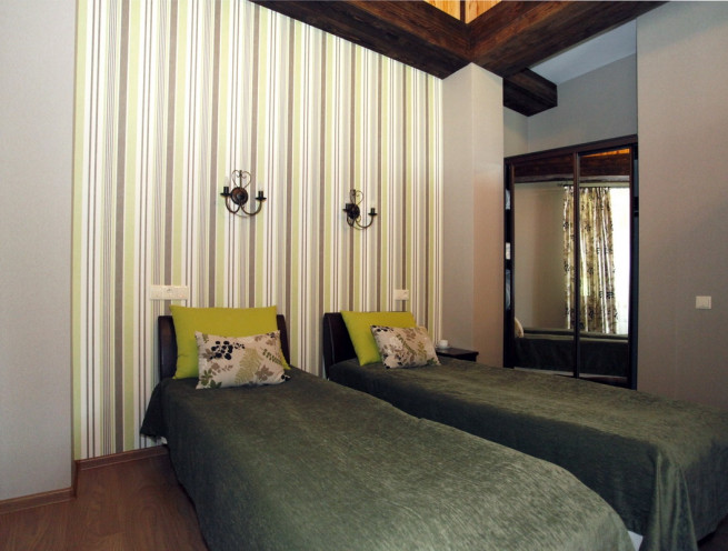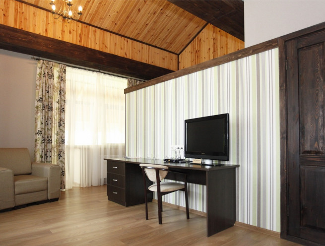 Окно выходят на южную сторону, веранда - на западную. Электронный замок. Номер оформлен в древесно-зеленых тонах. Двухместная раздвижная кровать, два шкафа- купе, диван, журнальный столик, сейф, холодильник, фен. Спутниковое телевидение. Спальная зона отделена от зоны отдыха. Санузел совмещенный. В стоимость включены принадлежности для душа, зубные наборы, тапочки, халаты.