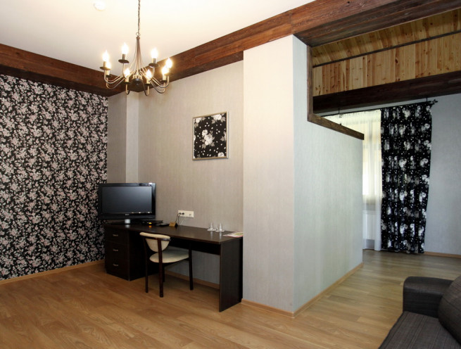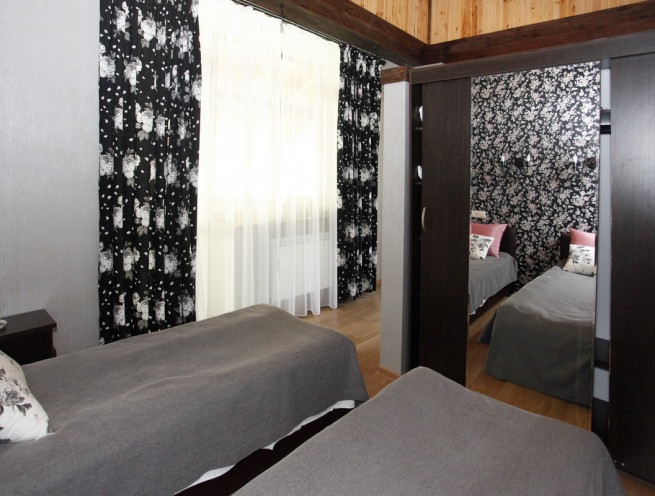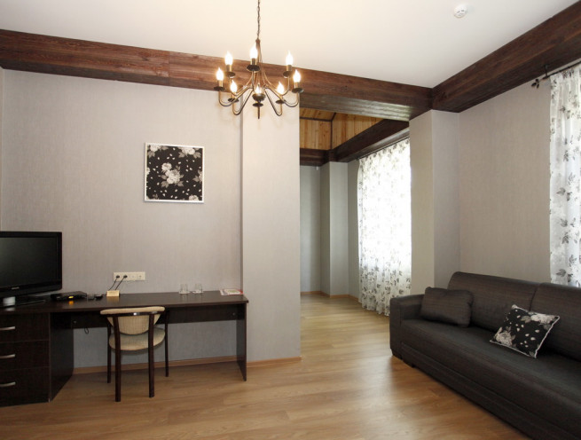 Окно выходит на север, веранда - на запад . Электронный замок. Номер оформлен в серебристо-синих тонах. В номере 2-х местная раздвижная кровать, два шкафа-купе, диван (раскладывающийся), кресло, журнальный столик, холодильник, фен, сейф. Спутниковое телевидение. Санузел совмещенный. В стоимость включены принадлежности для душа, зубные наборы, тапочки, халаты.
