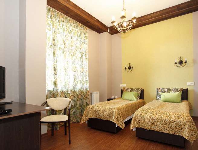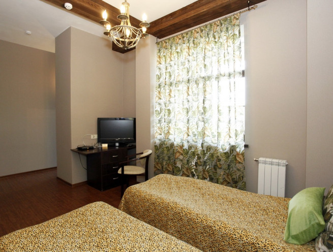 Окно выходит на юг. Электронный замок. Оформление в стиле "Сафари". 2-х местная раздвижная кровать, один шкаф-купе, журнальный столик, холодильник, фен, сейф. Спутниковое телевидение. Санузел совмещенный. В стоимость включены принадлежности для душа, зубные наборы, тапочки.