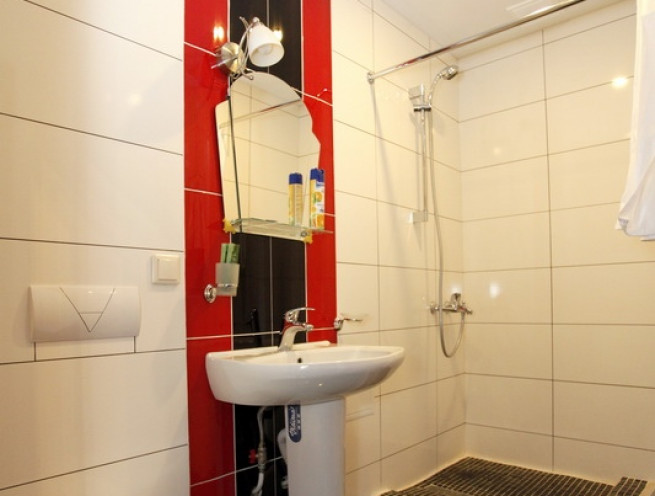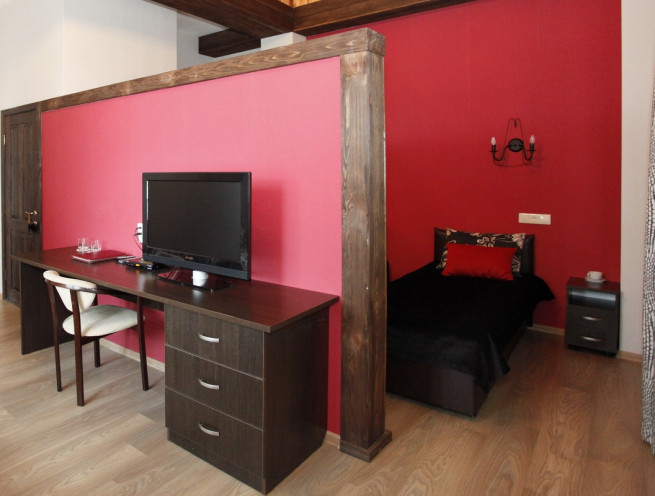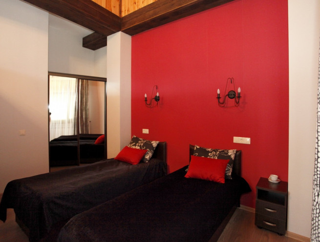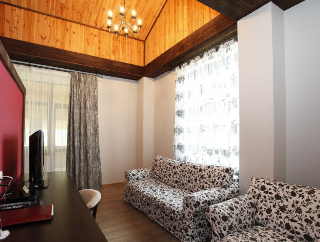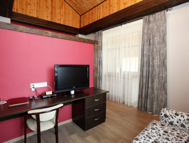 Электронный замок. Оформление в корраловых тонах. Окно выходит на юг, веранда - на восток. 2х местная раздвижная кровать, два шкафа - купе, холодильник, журнальный столик, фен, сейф, раскладывающийся диван. Спутниковое телевидение. Санузел совмещенный. В стоимость включены принадлежности для душа, зубные наборы, тапочки, халаты.