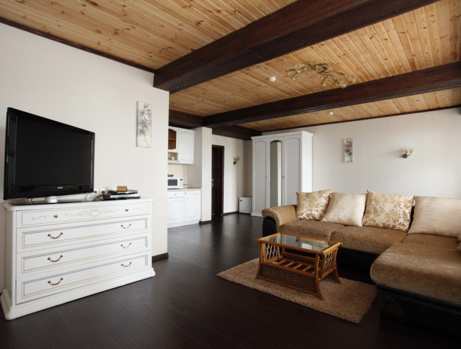 Окна выходят на юг. Оформлен в кремовых тонах. 2-х местная не раздвижная кровать, раскладывающийся диван,один комод, два шкафа-купе, туалетный столик. В номере будет красивый букет цветов, предоставленный магазином ОРАНЖ, который продает цветы в спб. Мини-кухня: гарнитур, холодильник, печь СВЧ, чайник, небольшая обеденная зона. Спутниковое телевидение, DVD. Санузел совмещенный. Электронный замок. Лоджия. В стоимость включены принадлежности для душа, зубные наборы, тапочки, халаты.