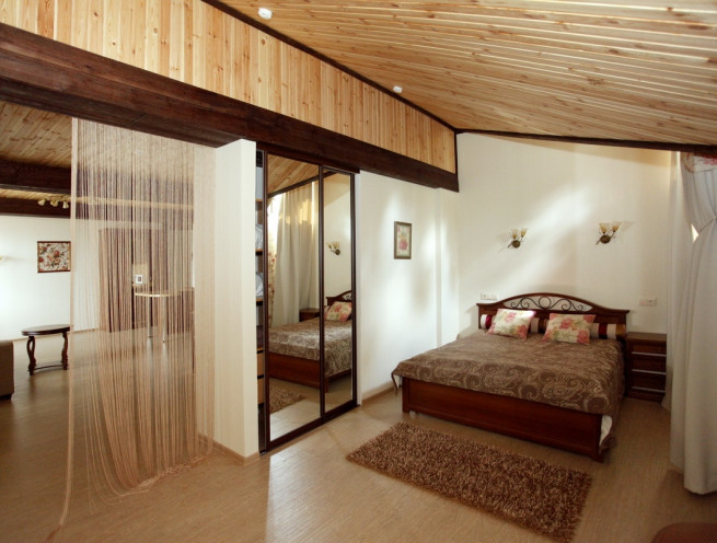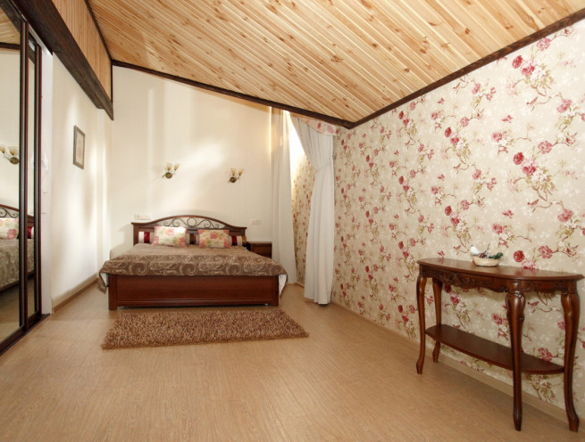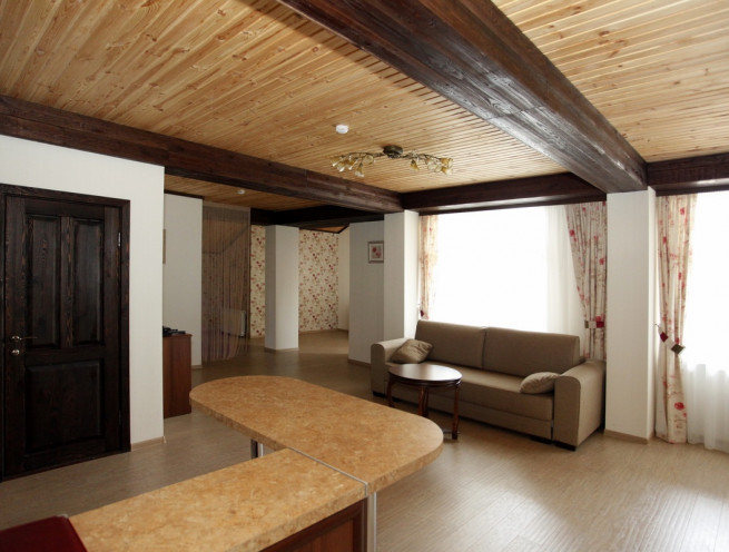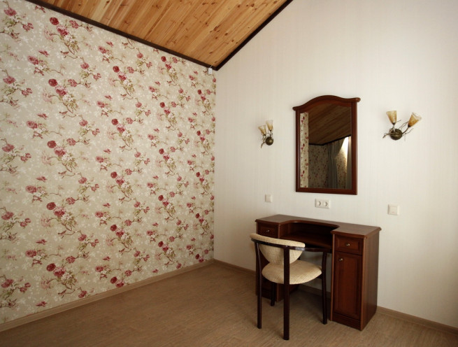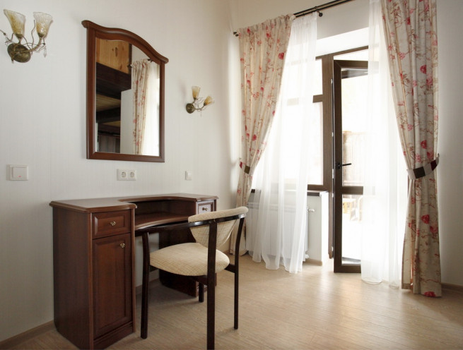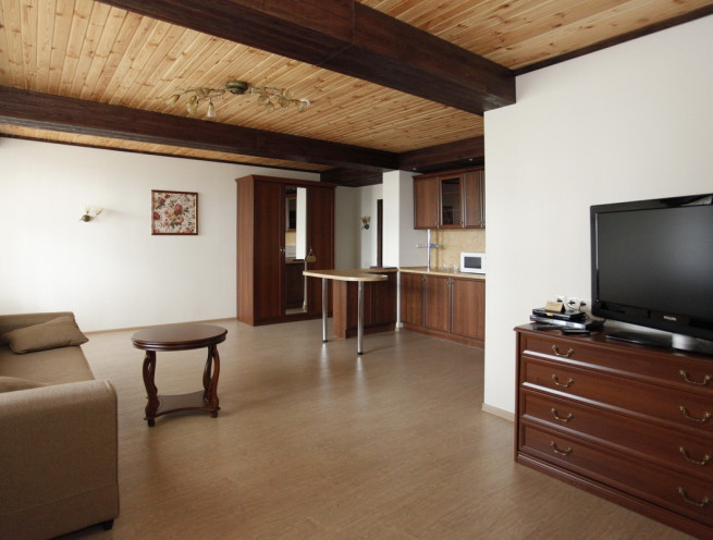 Оформлен в светлых, цветочных тонах. Окна выходят на юг. 2-х местная не раздвижная кровать, раздвижной диван, одно раздвижное кресло, комод, сейф, туалетный столик, фен. Мини-кухня: гарнитур, холодильник, СВЧ - печь, чайник. Спутниковое телевидение, DVD. Электронный замок. Санузел совмещенный. В стоимость включены принадлежности для душа, зубные наборы, тапочки, халаты.